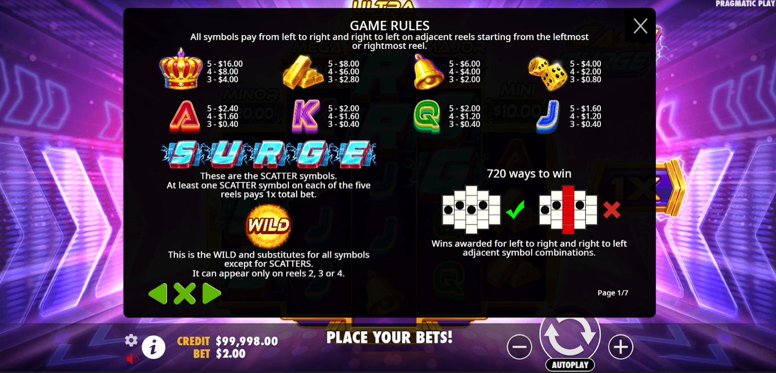 Rozptýlené písmená sa držia, kým nevypíšete SURGE a spustíte štyri Free Spins. Nové písmená pridávajú točenia a blesky môžu stále naraziť alebo udeliť progresívnu cenu — vďaka čomu je možná cena 5 000 × Ultra za jediný zap. Bez nákupu funkcií je kľúčová trpezlivosť a správa bankrollov; mnohí hráči budujú progresívnych hráčov v základnej hre pred výbuchom.